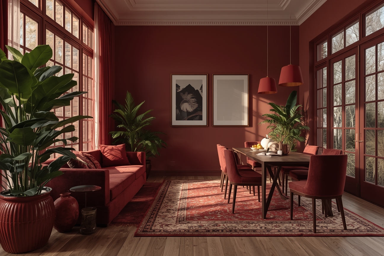 Bordeauxrote Akzentwand im Wintergarten für tiefe Raumwirkung